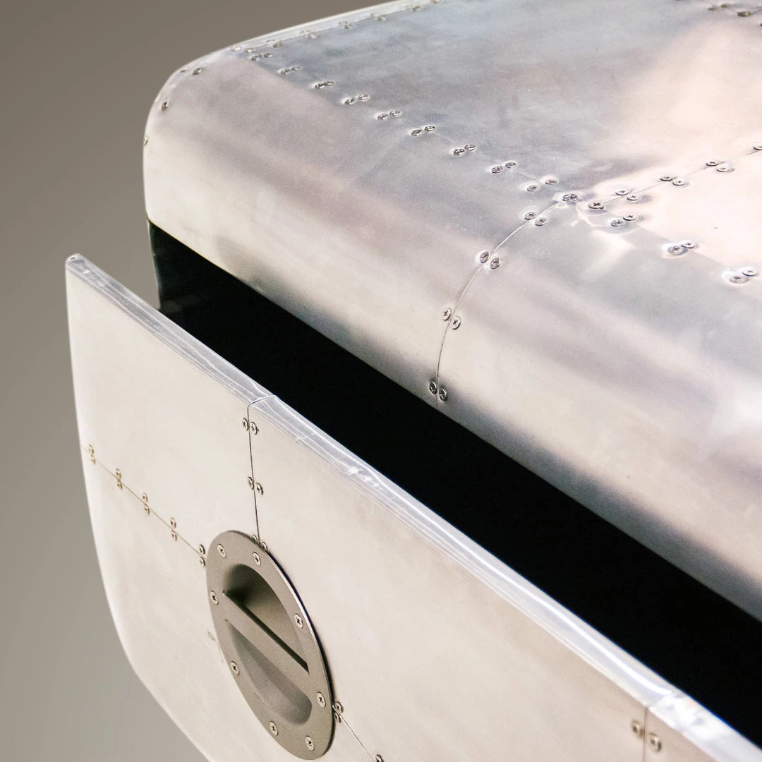 Based on World War II aircraft prototypes, this amazing Vintage Coffee table / Trunk with drawers will make a great addition to any home bar or to set off on its own in a place of honor. Completely handcrafted, with aluminum panels accurately replicating the riveted exterior of the plane, with detailed finishing, this piece is a work of Art in itself.