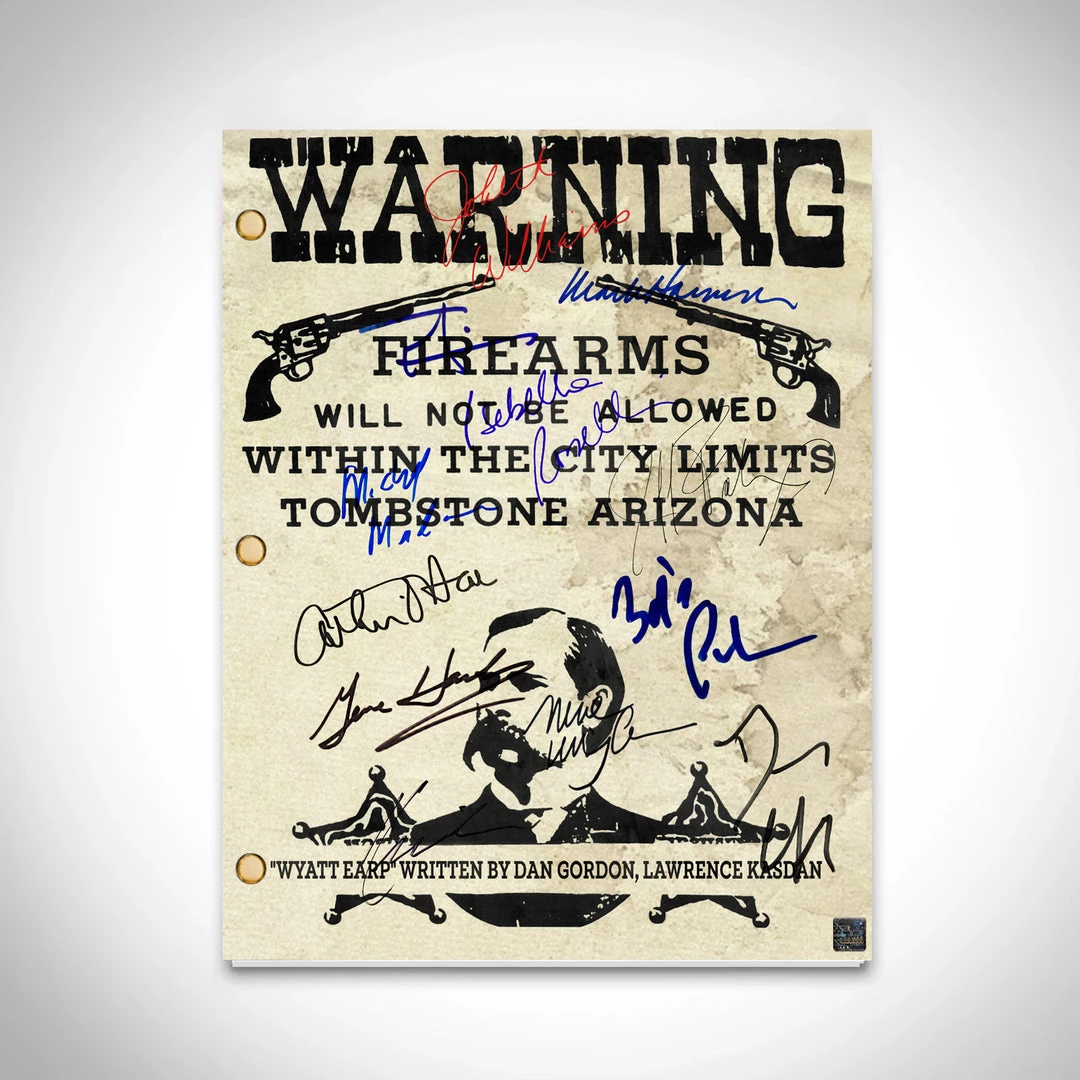 Pay homage to Wyatt Earp , with this Warners Bros. fully licensed facsimile of the official signed movie Transcript , originally signed by actors Kevin Costner, Dennis Quaid, Gene Hackman, Mark Harmon, Michael Madsen, Catherine O’Hara, Bill Pullman, Tom Sizemore, Jeff Fahey, Isabella Rossellini, JoBeth Williams & Mare Winningham , of which is strictly limited to 100 units Worldwide and has been approved and numbered accordingly.