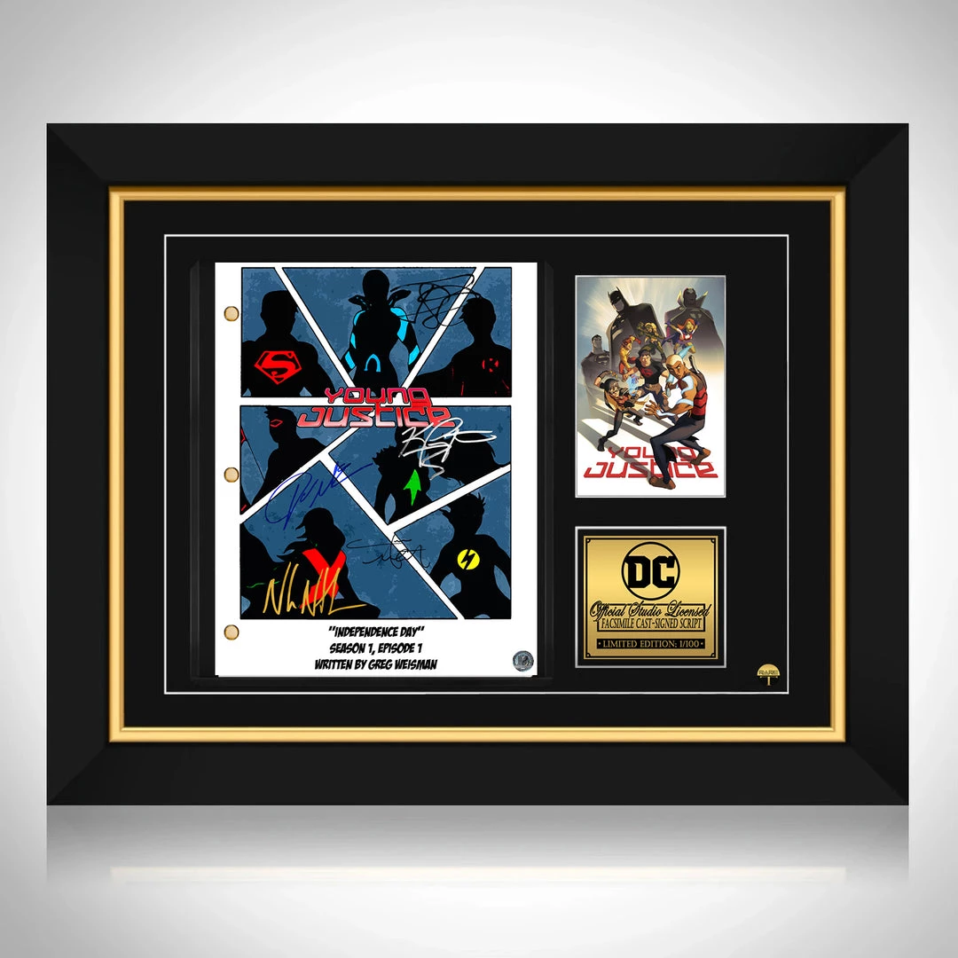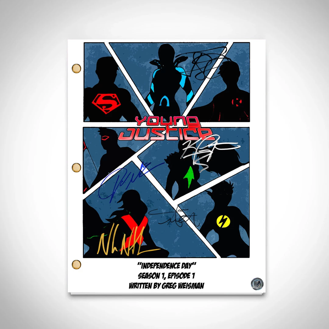 Pay homage to Young Justice , with this DC fully licensed facsimile of the official signed TV Series script, originally signed by actors Nolan North, Danica McKellar, Jesse McCartney, Khary Payton & Jason Spisak , of which is strictly limited to 100 units Worldwide and has been approved and numbered accordingly.