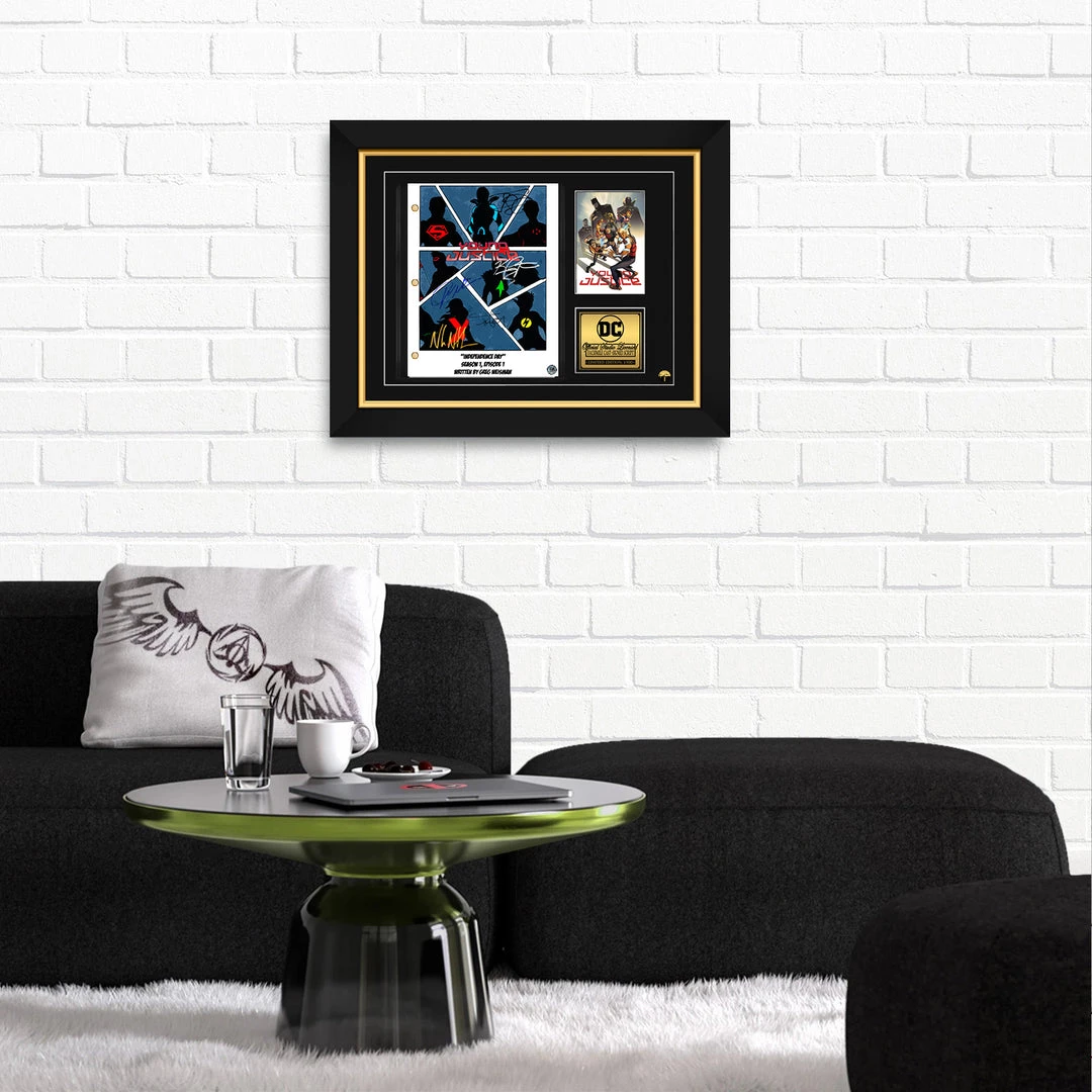 — Collector Grade Proprietary Exclusive VELVET TOUCH water/scratch resistant cover.— Collectible Facsimile of Original Hand-Signed Young Justice TV Series Script Custom Frame.