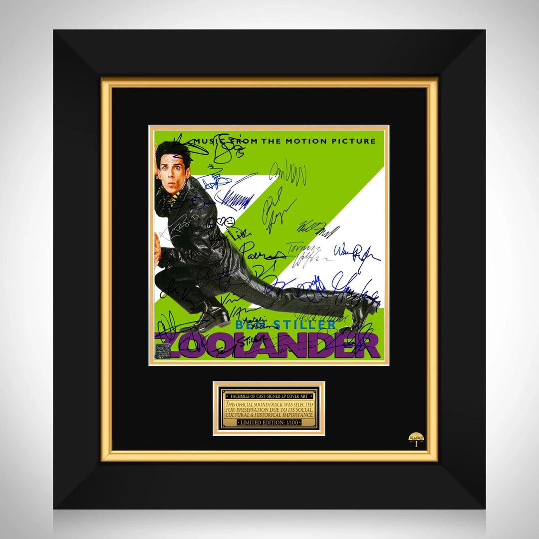Pay homage to one of the most iconic movie of all time, Zoolander , with this gallery-framed, officially licensed, limited edition facsimile of the Hand-Signed Music from the Motion Picture LP Cover originally signed by Ben Stiller, Owen Wilson, Will Ferrell, Milla Jovivich, Christine Taylor,Jerry Stiller, Jon Voight, David Duchovny, Donald Trump, Christian Slater, Cuba Gooding Jr, Tommy Hilfiger, Natalie Portman, Fabio Lanzoni, Lenny Kravitz, Gwen Stefani, Heidi Klum, Paris Hilton, David Bowie, Garry Shandling, Justin Theroux, Andy Dick, Patton Oswalt, Karl Lagerfeld, Winona Ryder & Vince Vaughn , of which is strictly limited to 100 units Worldwide, and has been approved and numbered accordingly.