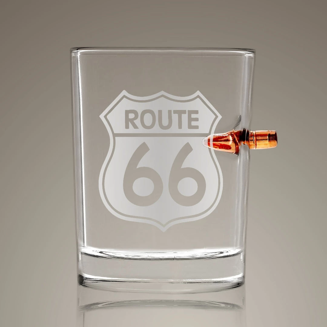 Ready To Ship! 48 Hour Shipping! Route 66′ Shot Glass – Handmade Route 66′ Etched Rock Glass Shot Glass With Embedded Bullet