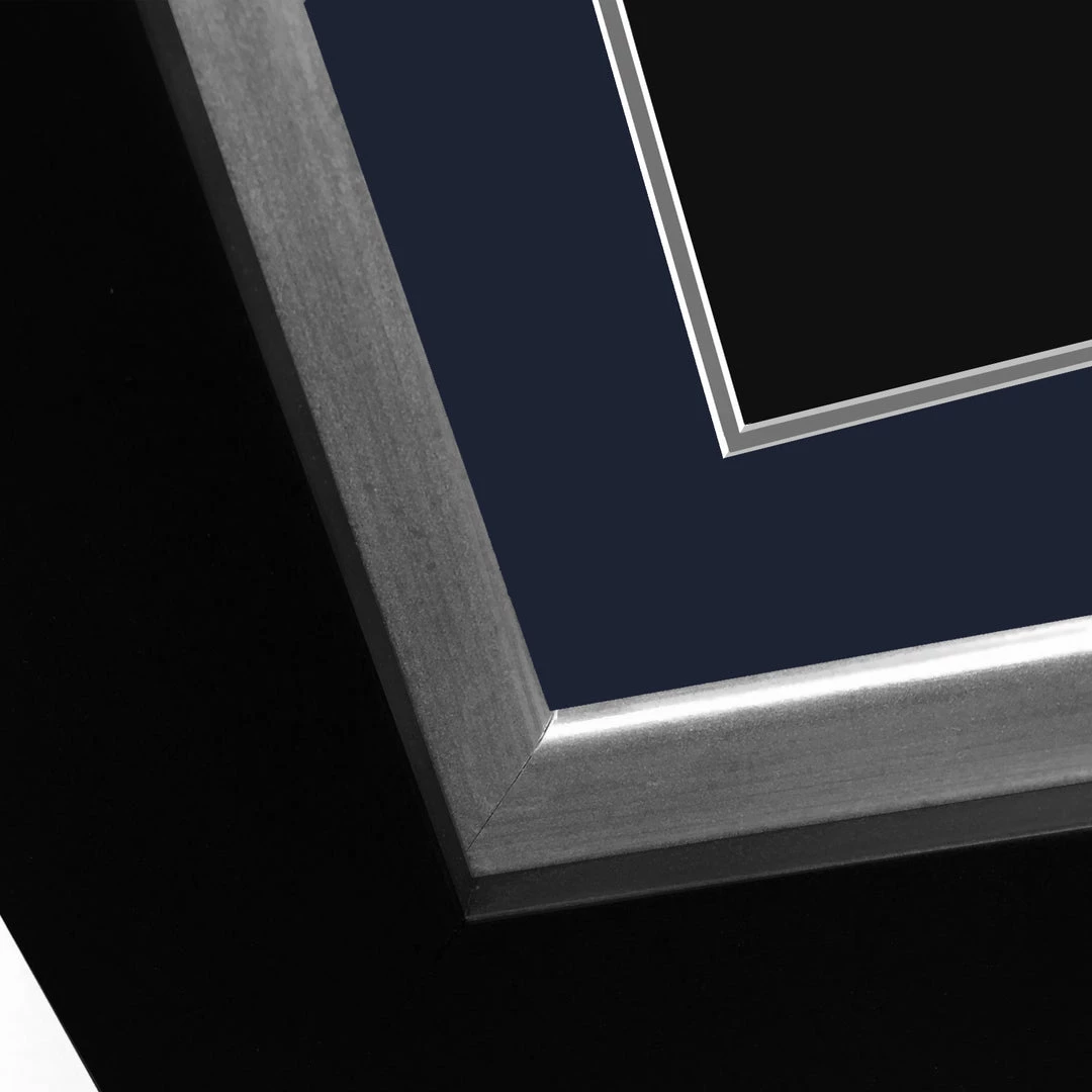 The triple matted display is mounted in a high-quality wood frame with metallic fillet trim and finished with protective glass to keep it looking pristine. The customized descriptive metallic plaque, in addition to the detailed finishing and openings, add to the elegant and sophisticated gallery quality look.