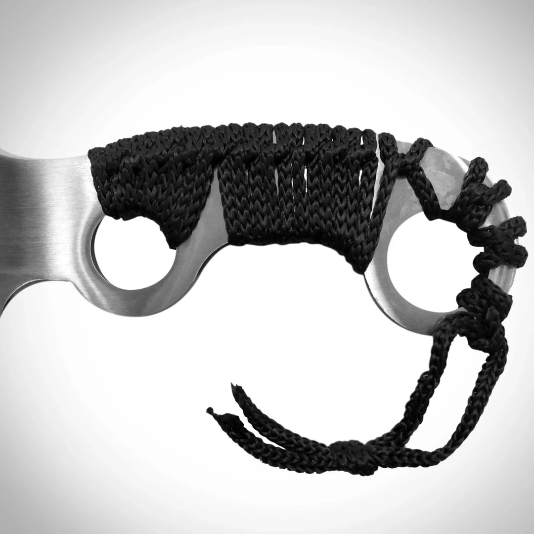 This Hunter Knife Destiny Dagger can be held in either fashion in the hand and still allows you to place the index finger into one of the two grip holes. The grip is black faux leather wound around to provide a secure gripping surface. Comes complete with a wooden stand and decorative plate- Decorate your home, business or office, with this incredible piece of entertainment history!