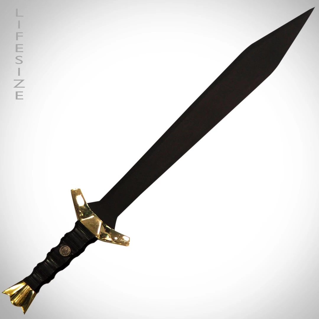 This specially-curated collection from RARE-T features a staggering array of High Quality Celebrity Fantasy Weapons and Pop culture Props from the world of classic movies, comics and video games superheroes and from best in the entertainment business. Handmade by talented artists from around the world, each and every one of these unique keepsakes represents a pop culture icon in vivid color and impeccable detail. Pay homage to King Arthur with these iconic Twin Swords. These accurately detailed prop are a tribute to the swords first used in the award winning movie King Arthur, by the iconic character Lancelot. Forged by hand out of 440 stainless steel, and measuring 26 inches each, these stylized Gladiuses have a slightly sharpened edge and black finish. A ridge runs down the diamond shaped blade. The guard of the swords is finished with golden steel and a stylized “V” shape seen in the movie. The golden pommels at the end of the swords are weighted to balance the swords.